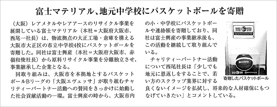 弊社はこの度、大阪市を本拠地とするバスケットボールBリーグの「大阪エヴェッサ」が取り組む「チャリティーパートナー」の活動に賛同し、チャリティーパートナーとして弊社倉庫を構える大阪市大正区の市立中学校4校へバスケットボールを各6球、計24球を寄贈致しました。