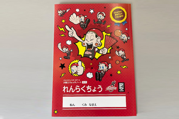この度弊社はバスケットボールBリーグの「大阪エヴェッサ」を通じて、大阪市へこの春入学する新一年生(浪速区内公立小学校=全6校 500名)に連絡帳を寄贈しました。