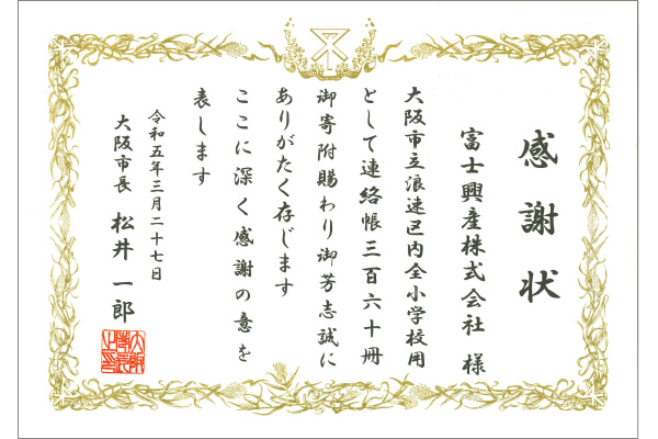 「大阪エヴェッサ」とのパートナーシップによる社会貢献活動の提案に賛同し、寄贈を行ったものです。また、連絡帳寄贈に対し大阪市長から感謝状を頂きました。
